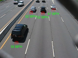 We were impressed with the results of our system. SpeedTrap efficiently and reliably tracks vehicle speeds as they travel down the road, and does so with a reasonable degree of accuracy. Noticeably, the performance of the tracking is very fast, and can handle 15 frames per second in real time. We suggest that the techinques used in our system would form a reasonable implementation of a production speed tracking system, if not for issuing citations, at least for automated measurement of traffic conditions.